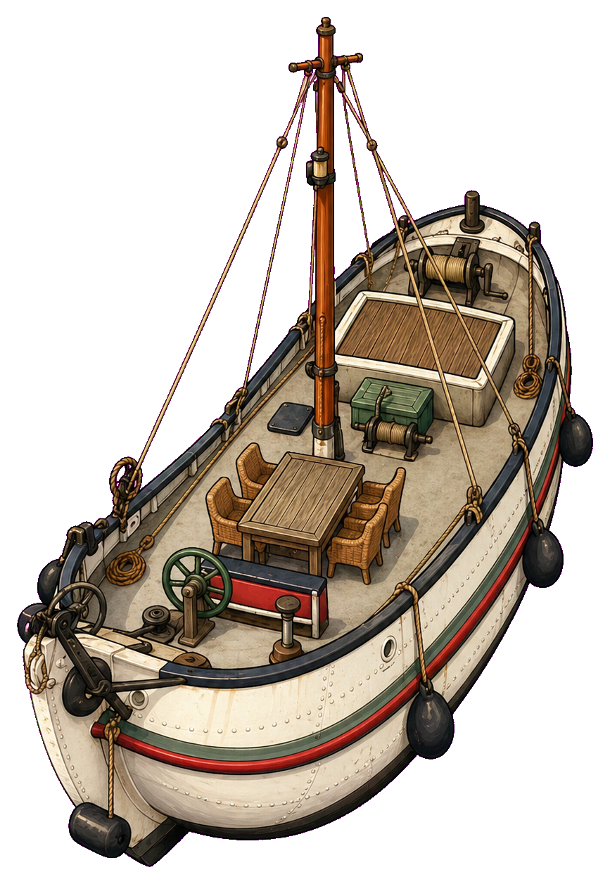A moody evening mooring with wet quay stones, amber lamps, and rain-dark reflections around the hull.